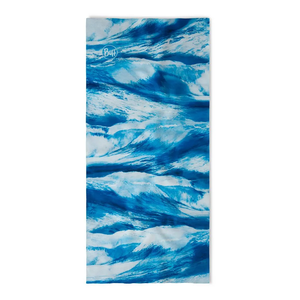 Scaldacollo multifunzionale leggero realizzato con bottiglie di plastica riciclate, che offre protezione solare UPF 50 e proprietà di raffreddamento evaporativo.