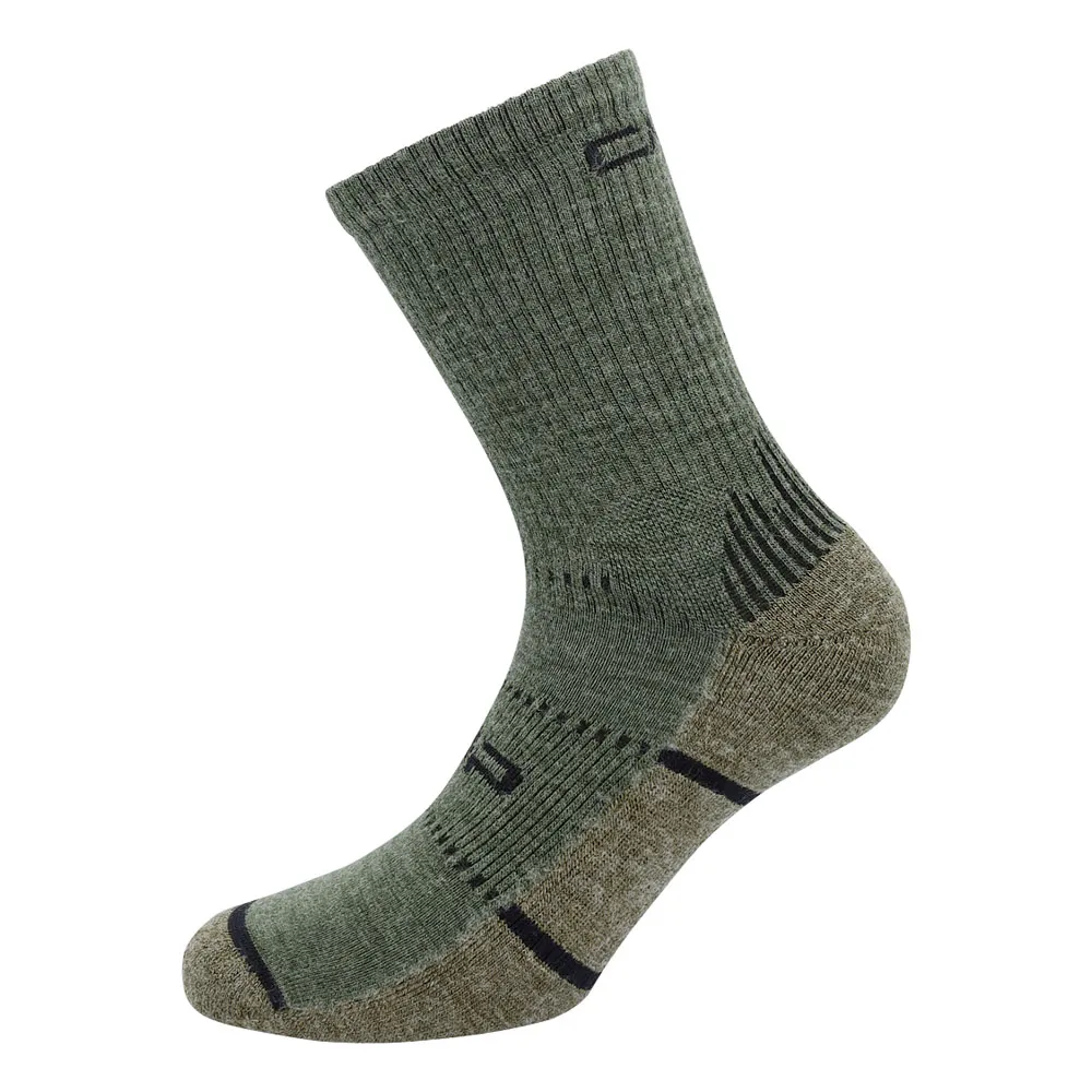 Calza a metà polpaccio in misto lana merino, con rinforzo in spugna sulla pianta del piede e una fascia elastica sul polsino per una vestibilità perfetta.