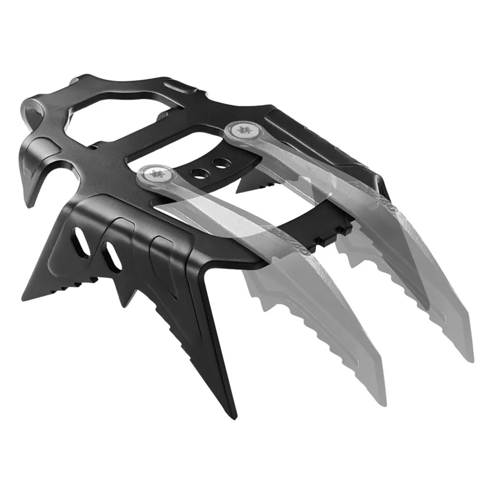 Parte anteriore per ramponi in acciaio temprato con 4 punte fisse e porta punte anteriori per utilizzo come punta singola o doppia.