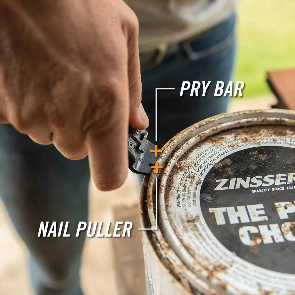È dotato di una lama in acciaio inossidabile a filo liscio, forbici a molla, un punteruolo, un leva, un apribottiglie, una superficie a martello e un driver per punte da 1/4” a doppio lato.