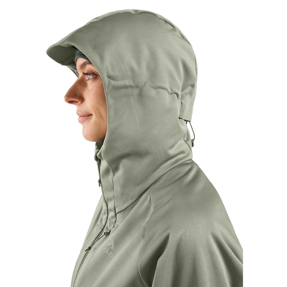 Questa giacca completamente accessoriata include anche un cappuccio regolabile, una cintura e polsini regolabili.