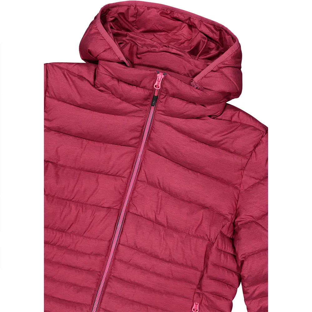 Dames donsjack van gemêleerde stof met capuchon, ontworpen om comfort, bescherming en een duurzame voetafdruk te bieden.