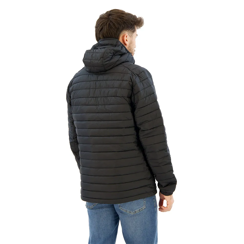 Deze puffer jacket is geïsoleerd met 100% gerecycled polyester, heeft een comfortabele capuchon met kinbeschermer en is voor het gemak op te vouwen in zijn eigen zak.