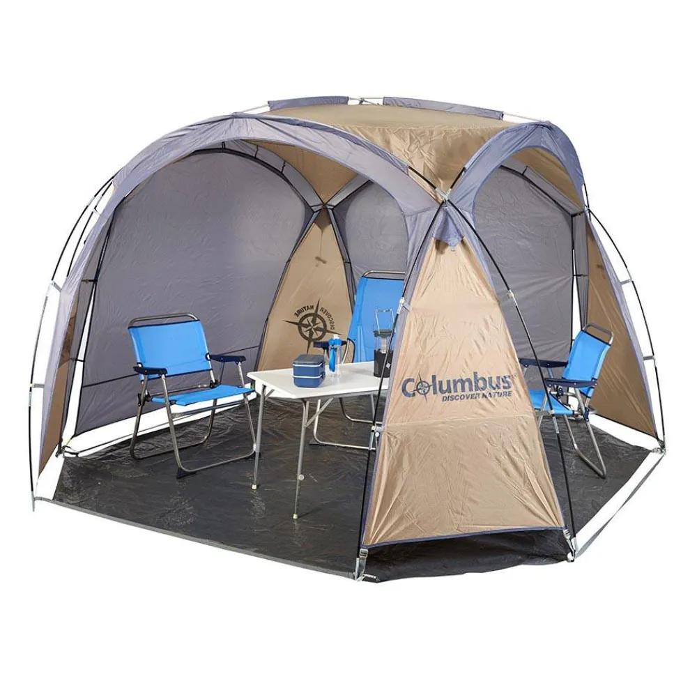 Het schaduwcentrum heeft een oppervlakte van 8,5m² om te genieten van gezinspicknicks. De 4 afneembare wanden kunnen in de meest geschikte positie worden geplaatst om te beschermen tegen lichte regen, zon en wind. De vloer kan gemakkelijk worden gemonteerd of gedemonteerd dankzij de clipbevestigingen.
