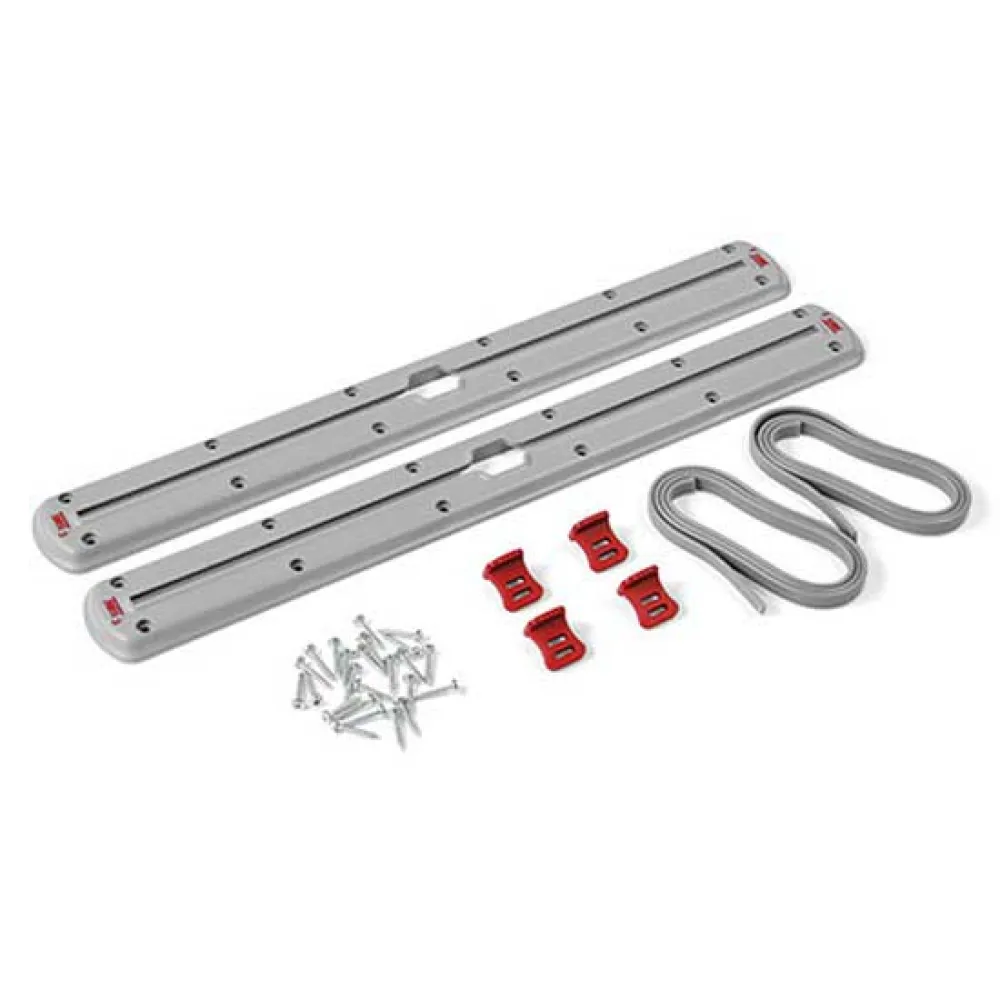 Deze uitgebreide kit biedt alles wat u nodig heeft voor een snelle en effectieve installatie. De twee duurzame ABS-rails kunnen verticaal of horizontaal op de wanden of de vloer van uw garage worden gemonteerd, wat volledige flexibiliteit biedt om aan uw specifieke indeling en behoeften te voldoen. De meegeleverde 24 bevestigingsschroeven zorgen voor een solide en permanente pasvorm, waardoor een betrouwbare basis voor het gehele systeem wordt gecreëerd. De vier verstelbare haken glijden soepel langs de rails, waardoor u aangepaste ankerpunten kunt creëren precies waar u ze nodig heeft. Ten slotte zorgen de twee sterke, elastische banden voor de perfecte spanning om alles, van omvangrijke stoelen tot kleinere gereedschapskisten, stevig op zijn plaats te houden, waardoor elke beweging wordt voorkomen, zelfs op bochtige wegen of oneffen terrein.