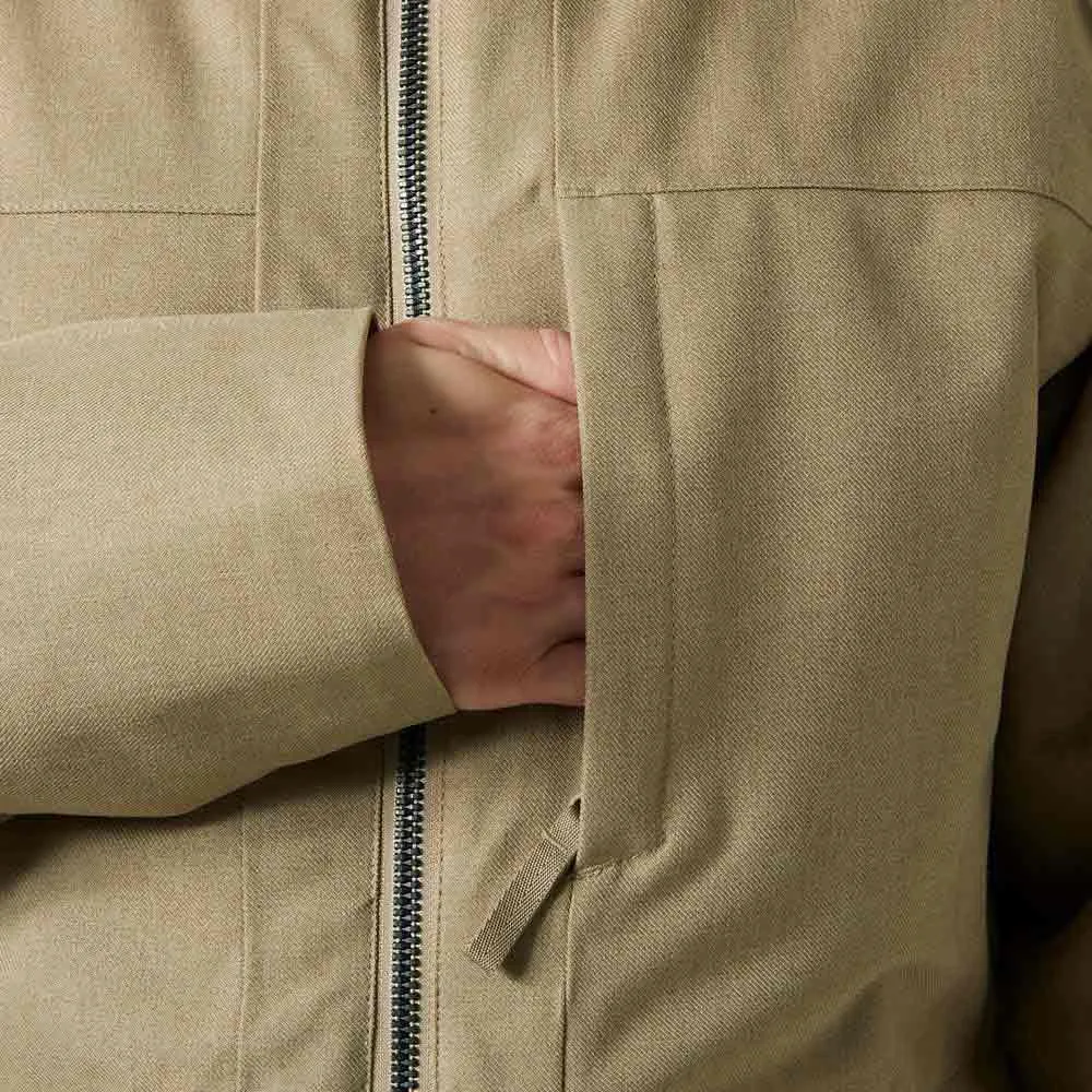 Een afneembare en verstelbare capuchon zorgt voor aanpassing, terwijl zakken, waaronder een borstzak met rits, functionele opbergruimte bieden.