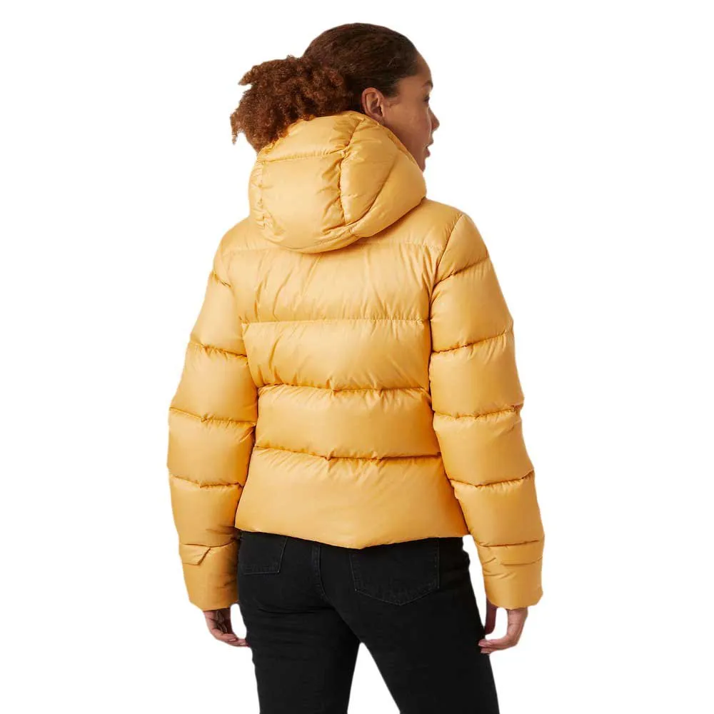 Een kort damesdonsjack met slimme eigenschappen voor warmte en veiligheid.