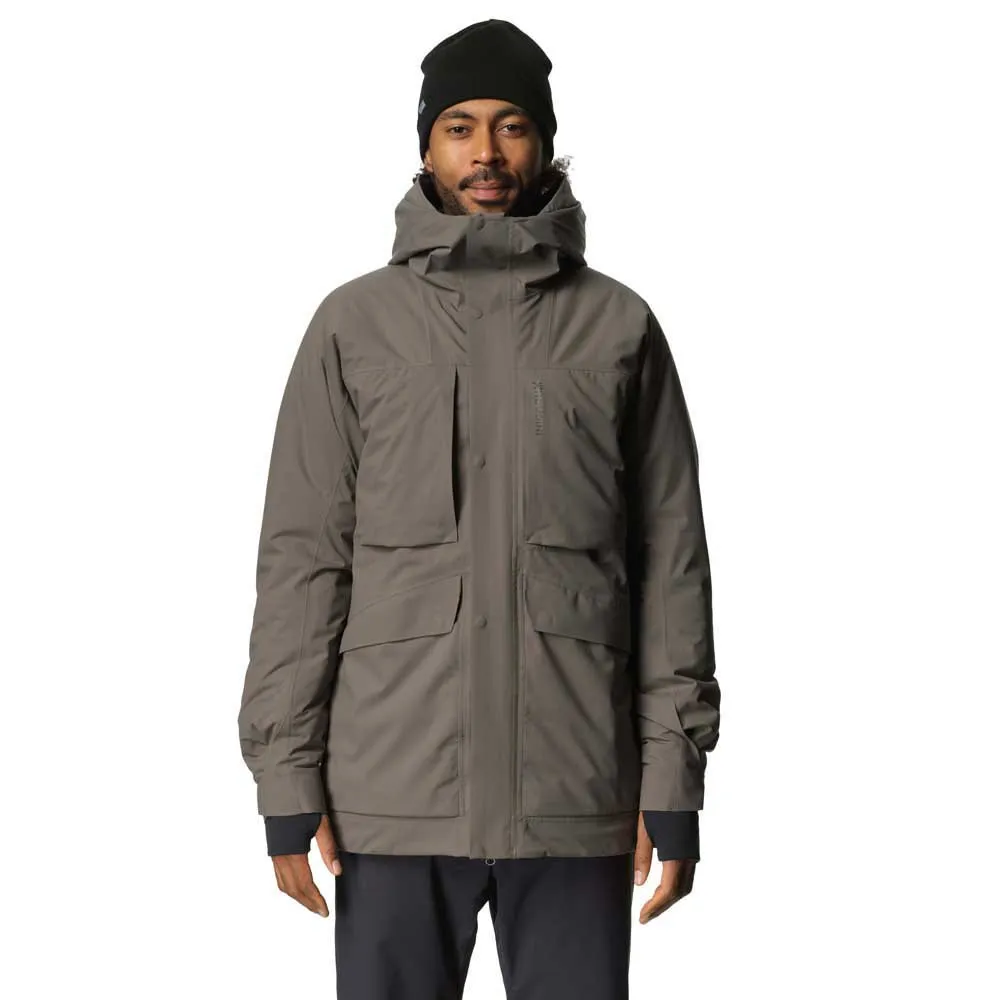 De buitenstof heet Spheric 2 layer Hardshell. Het is volledig waterdicht en houdt je droog bij regen, sneeuw of hagel. De isolatie is Primaloft Silver, een lichte, warme en zeer samendrukbare synthetische vulling. We geven de voorkeur aan synthetische vulling vanwege de prestatievoordelen, maar ook omdat we niet geloven in het stelen van veren van vogels om onszelf warm te houden. De jas heeft een grote, 2-weg verstelbare capuchon en warmtebarrières rond de halslijn en onderkant. Je hebt alle zakken die je maar kunt wensen: twee externe borstzakken, twee handzakken, één binnenborstzak en één binnen mesh opbergzak.