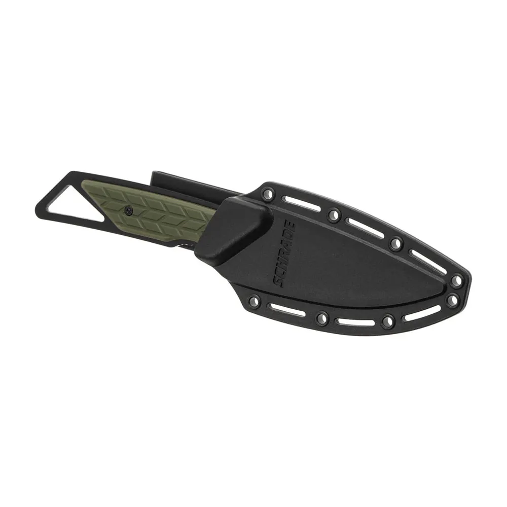 Inbegrepen bij dit uitzonderlijke vaste mes is een duurzame polyester riemschede die meer doet dan alleen het mes beschermen. Het beschikt over een geïntegreerd opbergvak met twee essentiële survivalaccessoires: een ferro rod vuurstarter en een slijpsteen. Deze briljante functie betekent dat u altijd de middelen hebt om een ​​levensreddend vuur te maken en een vlijmscherpe rand op uw mes te behouden, hoe ver u ook van de bewoonde wereld verwijderd bent. Het gemak van het hebben van deze gereedschappen die rechtstreeks aan de schede van uw mes zijn bevestigd, zorgt ervoor dat u altijd voorbereid bent op het onverwachte, waardoor de Outback een onmisbaar onderdeel van uw kampeeruitrusting is. Als het gaat om betrouwbare buitenmessen, zet de Schrade Outback een nieuwe standaard voor paraatheid en functionaliteit.