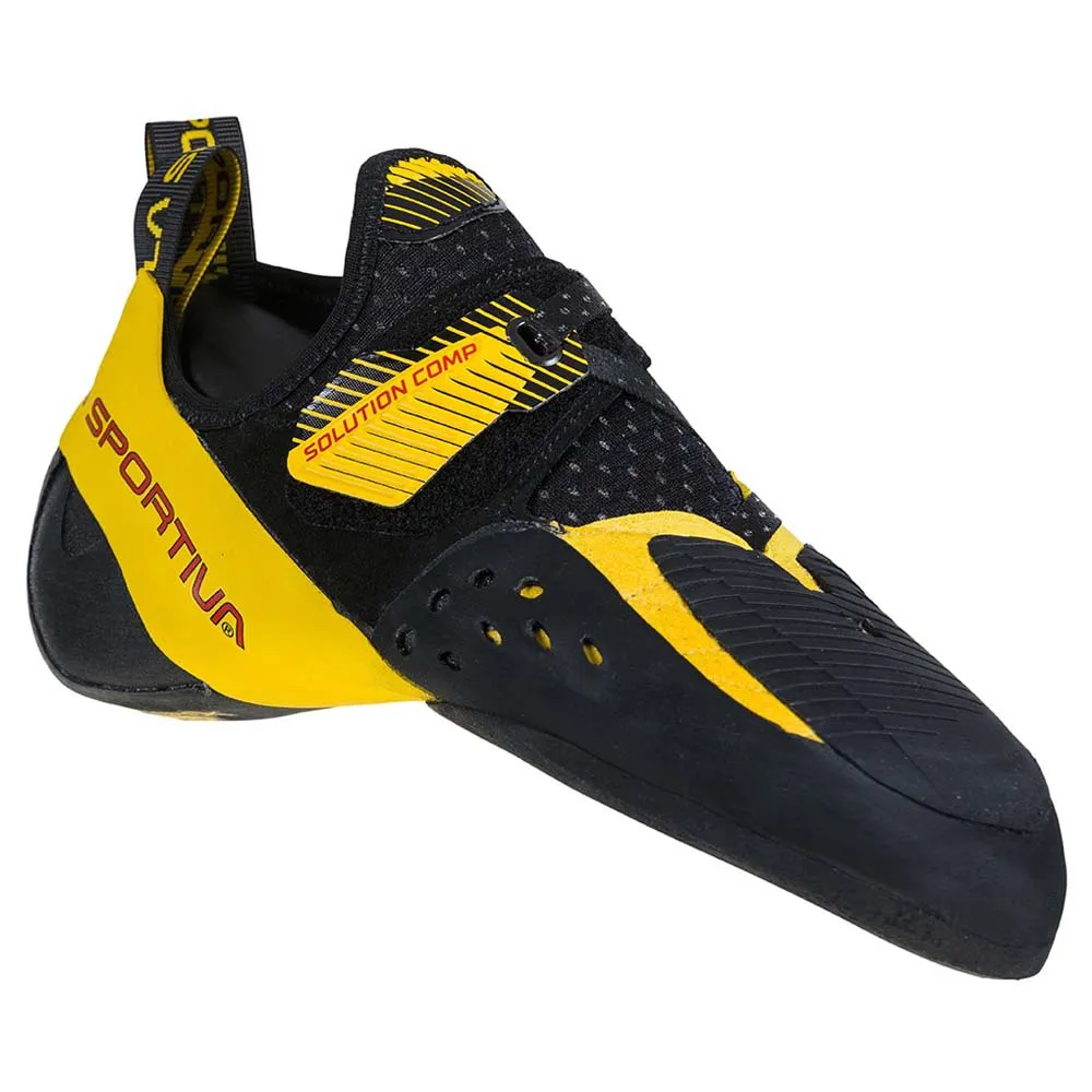En klatresko i toppklasse for innendørs buldring og sportsklatring. La Sportiva Solution Comp er en aggressiv modell som betydelig forbedrer ytelsen. Den har en presis tåboks for tekniske bevegelser og en forbedret, smalere hæl perfekt for sikker hælkroking. Mykere enn den originale Solution, tilbyr den utmerket grep og en tettsittende passform av høy kvalitet. Mange klatrere anbefaler å gå ned i størrelse for optimal ytelse både på stein og i klatrehallen