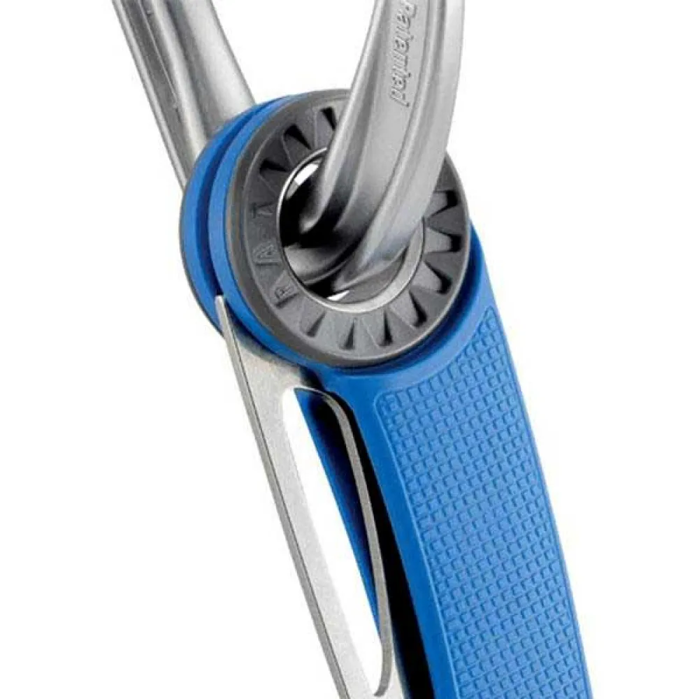 Den har et hull for en karabinkrok for å feste den i selen. Det er lett å manipulere med sin teksturerte hjul, selv med hansker, og kan låses i åpen stilling.