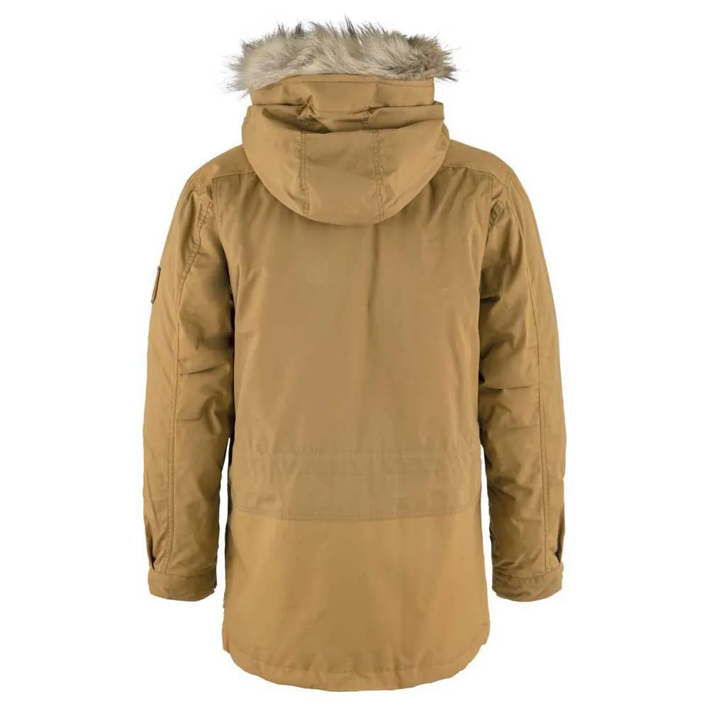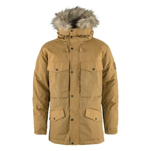 Ciepła i wytrzymała kurtka puchowa o tradycyjnym, długim kroju. Klasyczny, długi model wykonany z wytrzymałego materiału G-1000 i ekstra wytrzymałego G-1000 HeavyDuty na ramionach i plecach. Idealny do zimowych aktywności o niskiej intensywności w bardzo niskich temperaturach. Dwie duże kieszenie z zamkiem błyskawicznym na piersi z kieszeniami zapinanymi na guziki na górze. Ponadto są kieszenie otwierane od góry niżej oraz wewnętrzna kieszeń i siatkowe kieszenie na drobiazgi. Sznurki w pasie i na dole oraz regulacja na rzepy na mankietach. Jest to zaktualizowana wersja klasycznej parki Fjällräven, teraz z bardziej ekologicznymi tkaninami i ulepszonymi funkcjami i dopasowaniem.