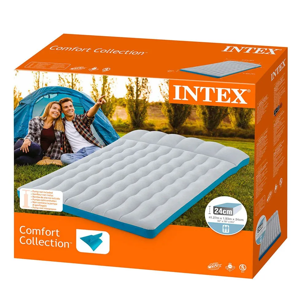 Dmuchany materac Intex z gamy Camping Mats o wymiarach: 127 cm (szerokość) x 193 cm (głębokość) i wysokości 24 cm.