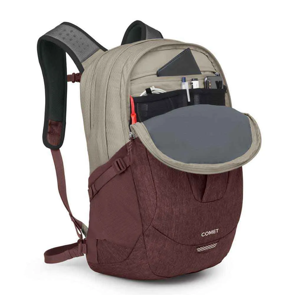 Plecak OSPREY Comet w kolorze Sawdust Tan / Raisin Red to stylowy i uniwersalny plecak odpowiedni do codziennego użytku i przygód na świeżym powietrzu. Wykonany z dbałością o szczegóły, ten plecak łączy funkcjonalność z estetyką.