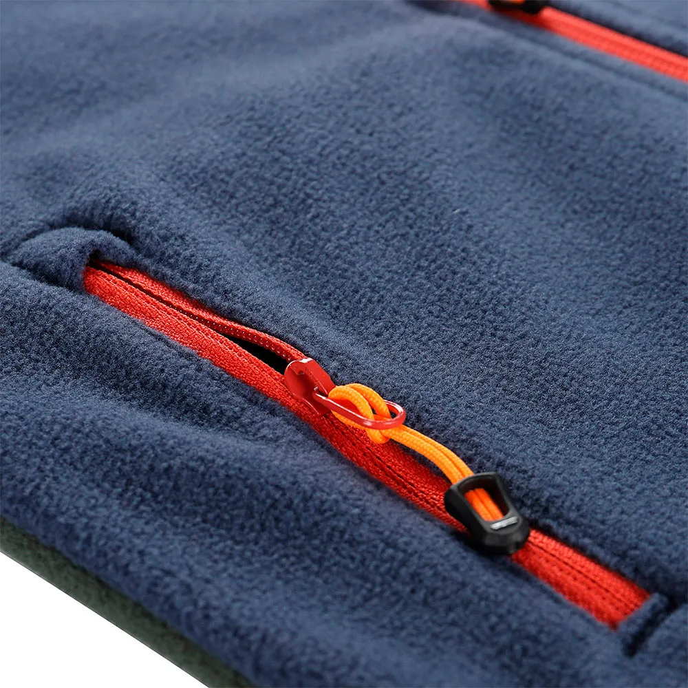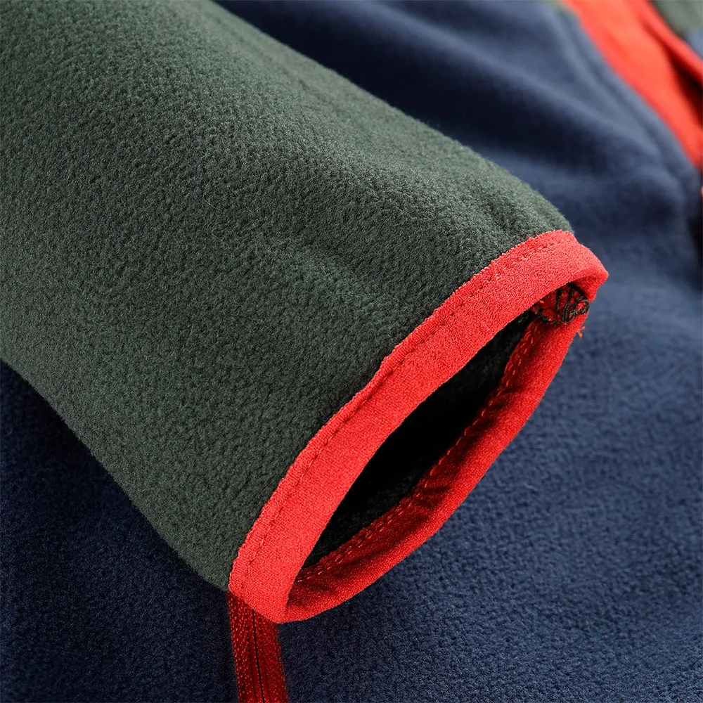 microfleece, relevo, corte regular, gola estendida, proteção para o queixo, mangas com acabamento elástico, parte inferior com acabamento elástico, bolsos total 2, frente com zíper, patch na manga, puxadores mais longos para fácil manuseio.