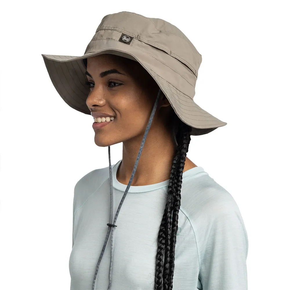 Proteção solar UPF 50, ajuste ajustável e uma alça com cordão fazem deste o chapéu perfeito para longos dias ao ar livre.