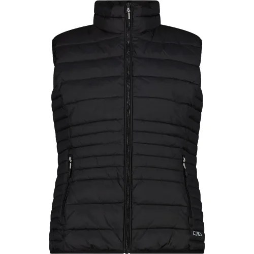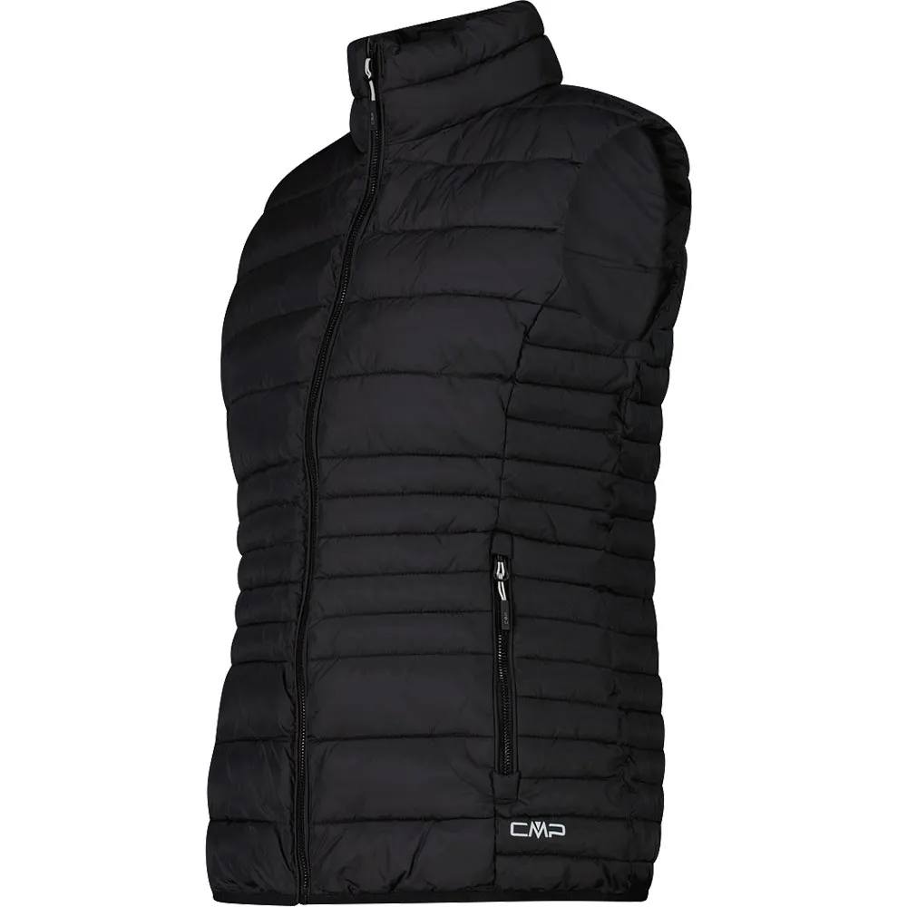 Colete feminino confeccionado com um exterior repelente à água de cor sólida, ideal para oferecer proteção contra vento e humidade com um estilo essencial e versátil.