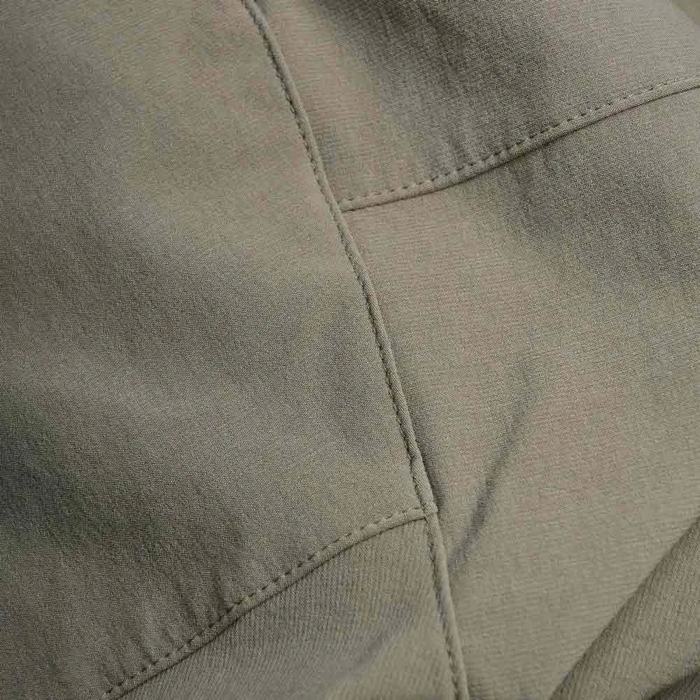 - Confeccionado em tecido Granite stretch, um tecido elástico de trama dupla revestido com DWR sem fluorocarbono que oferece excepcional resistência ao vento, repelência à água e gerenciamento de umidade sem sacrificar a mobilidade.
