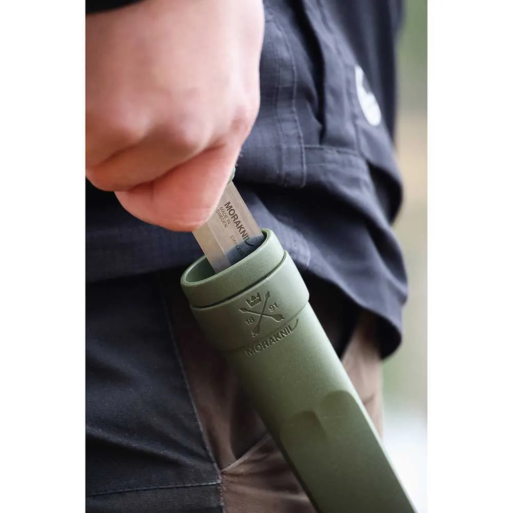 O cabo ergonômico de polímero em formato de barril possui uma empunhadura macia de fricção, protetor de dedos e uma lâmina de 2.5 mm de espessura, retificada em perfil, feita de aço inoxidável sueco reciclado, que proporciona força e estabilidade em cada corte. Graças ao design da lâmina e do cabo, a faca é ideal para trabalhar com segurança e eficiência em diversas condições climáticas durante todas as estações da caça. A bainha de polímero da faca é simétrica, o que significa que serve tanto para usuários destros quanto canhotos, e possui uma tira de couro feita de couro sueco curtido vegetalmente que pode ser facilmente fixada ao seu cinto. Compatível com o Kit Multi-Mount Morakniv para Kansbol.