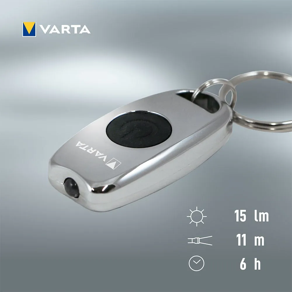 Porta-chaves em metal Varta com lanterna leve. Lanterna de chaveiro super compacta feita de liga de zinco cromado de alta qualidade. Led branco de 5 mm que oferece um melhor feixe de luz em dois modos de iluminação: alto e baixo. desliga-se automaticamente após 10 minutos de uso contínuo. grande e confortável que é operado pressionando-se uma vez.inclui o chaveiro. Alcance do foco: até 11 m. duração: até 6 h. potência de iluminação total: até 15 lumens. fonte de luz: leds de 5 mm.