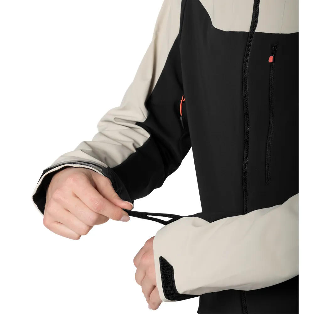 Tillverkad av vindavvisande 2-lagersmaterial, denna softshelljacka får höga poäng för andningsförmåga, lätthet och komfort. Dessutom är den tillverkad av återvunna material för ett hållbart val. Hållbart skydd mot väder och vind: Den andningsbara Radical softshelljackan för damer tillverkad av återvunna material får helt enkelt inte saknas på någon skidtursutflykt. Vind, snö, lätt regn och däremellan lite solsken. I bergen gör vädret som det vill. Med Radical softshelljackan är du ordentligt förberedd för allt. Den innovativa, miljövänliga hybridjackan består av ett återvunnet 2-lagers softshellmaterial. Den är 100 % vindtät och erbjuder samtidigt starkt skydd mot måttligt regn eller snö med sin PFC-fria DWR-behandling. Tack vare den höga andningsförmågan hos det slitstarka materialet svettas du inte under utmanande klättringar och din kroppstemperatur hålls alltid idealiskt reglerad. Du kommer inte heller att sakna komfort: Materialets borstade insida känns behagligt mjuk mot huden. Dragkedjor under armarna ger extra ventilation under varmare turdagar eller vid särskilt intensiv ansträngning. Jackan med sin höga grad av stretch har en atletisk passform för stor rörelsefrihet i all terräng. Den har en dragkedja i full längd och flera fickor för att förvara småsaker. Den justerbara huvan och stretchmuddarna ger extra skydd. Dess dragskojustering i fållen garanterar en perfekt, halkfri passform. Kombinerat med Radical softshellbyxor har du ett perfekt koordinerat paket både tekniskt och estetiskt för dina skidturer. Radical softshelljacka – redo för alla äventyr.