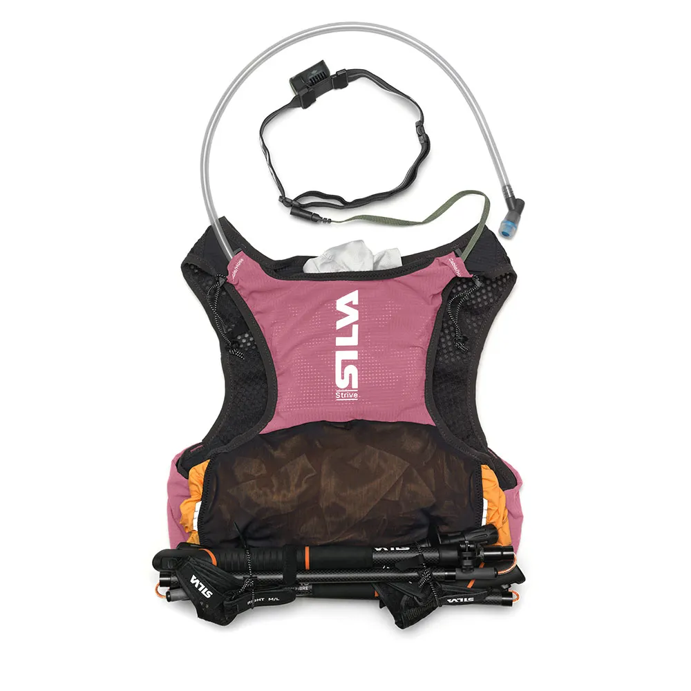 Västen har fack för vätskeblåsa, mjuka flaskor och fästen för löparstavar.