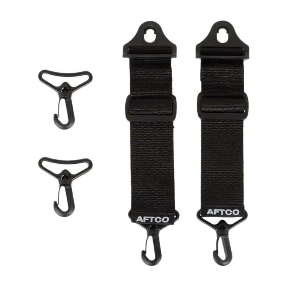 Designet til AFTCO kæmpende bælter og fiskeri seletøj, men kan tilpasses enhver fiskeri bælte eller kæmper sele. AFTCO Drop stropper er designet til at blive brugt i stedet for bælte stropper om bekæmpelse af bælter og med "Quick Clips" tillægger indlæg på hver side af AFTCO Fighting Bælterne. Swivel snap clips på den modsatte ende af hver strop derefter tillægger D-ringe på alle stå op sele til at fuldføre fisken kampsystem. Også inkluderet er valgfri svirvel snap clips til at erstatte de "Quick Klip", så stropperne passer enhver bælte. Drop stropper er justerbare til at tilpasse placeringen af ​​kampene bælter på låret for maksimal gearing.
