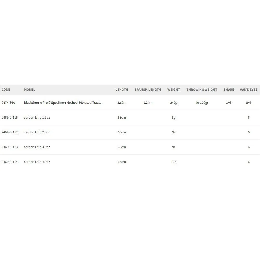Fås i 3,90m med en kastevægt på 40 80gr og i 4,05m med en kastevægt på 50 100g.