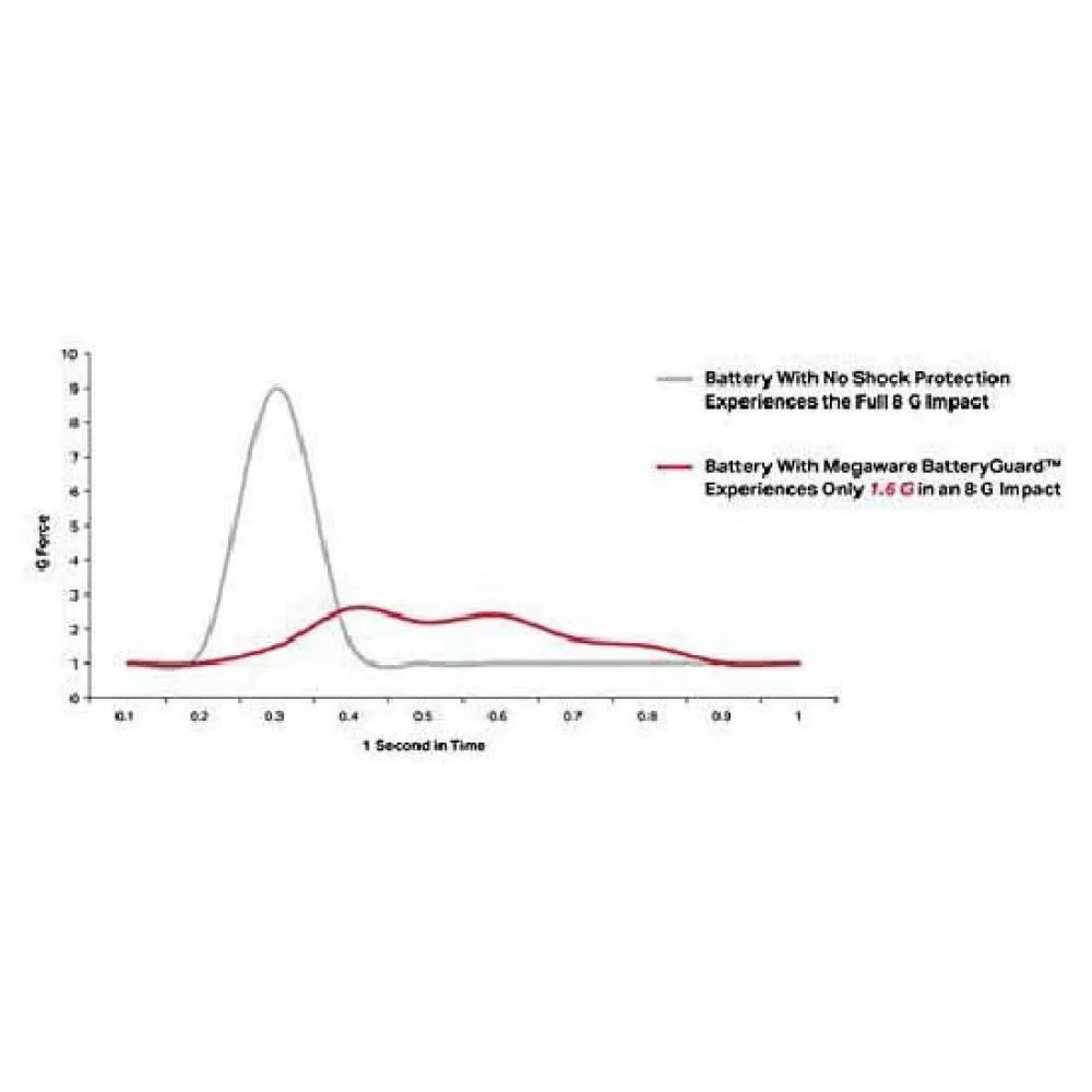 Megaware BatteryGuard™ sidder under dit batteri og absorberer tyngdekraftstødet forårsaget af overdreven vibration og op- og nedspring.