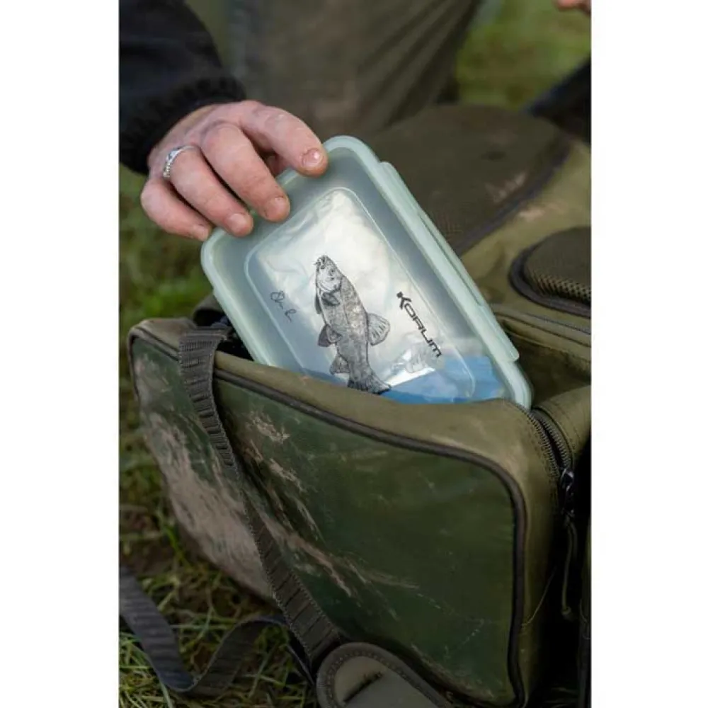 Korum Classic-serien tilbyder produkter, der er synonyme med traditionelt grovfiskeri. Til dagsessionfiskeri er det fantastisk at have en dedikeret kasse til dit måltid ved bredden. Denne lufttætte beholder har rigelig plads til sandwich, kager, drikkevarer og chips. Den har det smukke arbejde af fiskekunstneren Steve Phillips. En vidunderlig fiskegave.