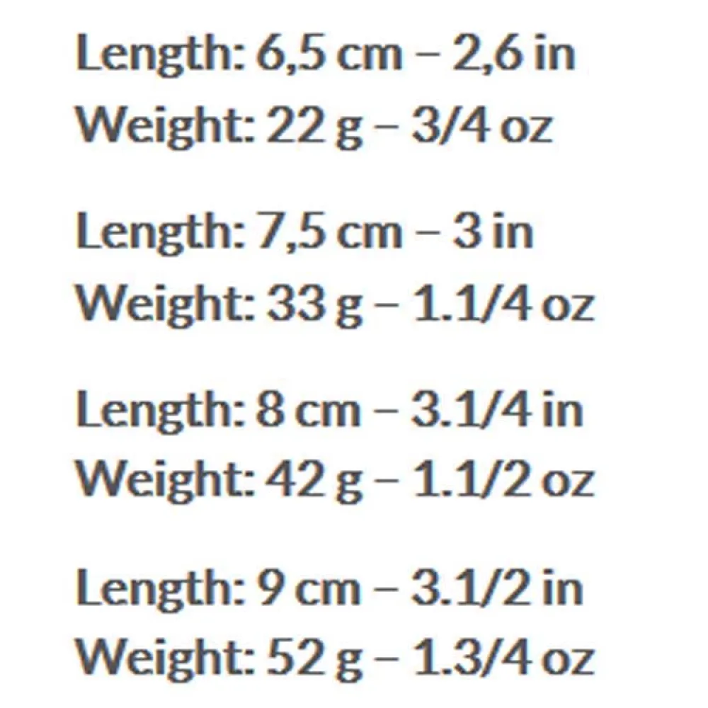 Ved sammenligning af vægten har Jugulo FS en mindre størrelse, det øger den attraktive kraft af agnen, når rovdyr er meget selektive og bruges til at jage små fisk eller foderfisk.