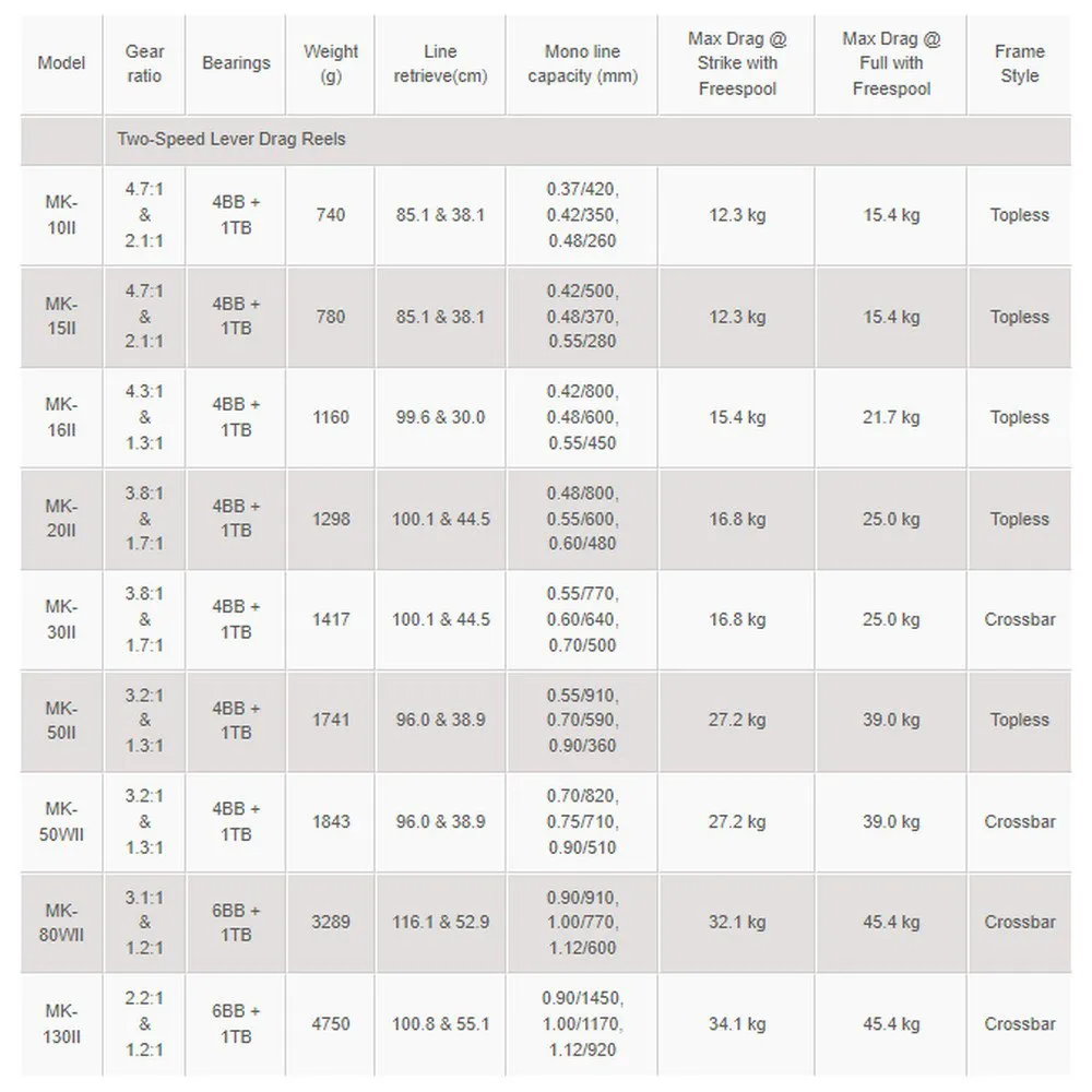 Konstrueret til den ultimative udfordring inden for storvildtsfiskeri, er OKUMA Makaira Trollinghjulet højdepunktet af styrke og præcision. Dets 6061-T6 maskinbearbejdede aluminiumsramme og 17-4 rustfri stål spiralformede gear leverer kompromisløs kraft og jævnhed. To-hastighedssystemet og Carbonite Dual Force bremsen giver dig kontrollen til at tæmme havets monstre. Med en fuld korrosionsbestandig belægning, præcisionslejer i rustfrit stål og en lydløs anti-revers, er Makaira bygget til ubarmhjertig ydeevne og holdbarhed sæson efter sæson