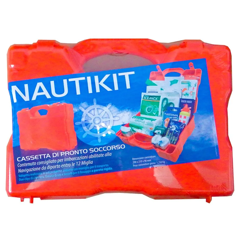 Førstehjælpssæt plastikbeholder i orange farve til Natanti Finoat 10 meter i længden og navigation inden for 12 miles fra kysten.Dim.