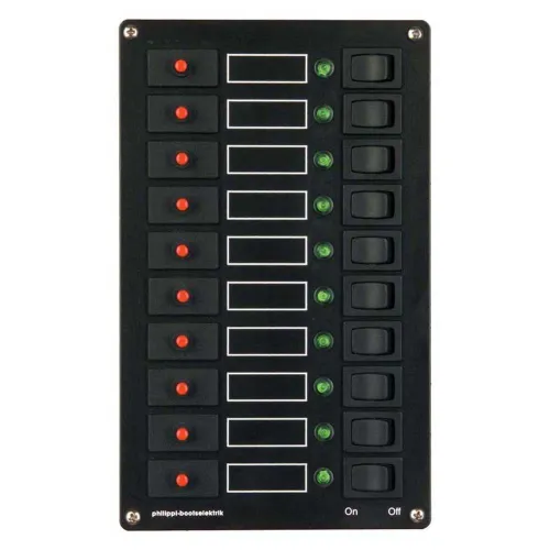 - Sikringsskinne med 10 kredse med E-T-A 1140-seriens termiske afbrydere, LED-display og vippekontakter, nominel strøm 8A.