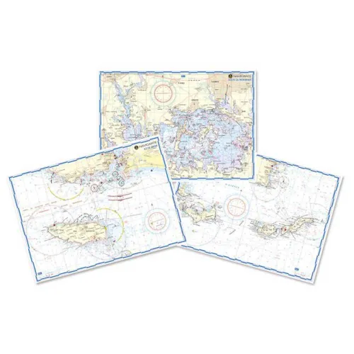 De indeholder nautisk information på bagsiden og er skrevet på engelsk og fransk.