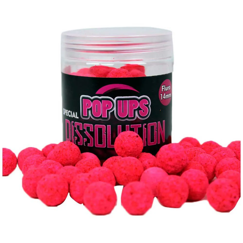 Fluor Pop Ups Dissolution lavet med de bedste melsorter på markedet, og vores innovative belægning, der frigiver en lodret og vandret sky af farve og dens kraftfulde aroma såsom sød, frugtig og citrus MB2 og krabbe kombineret med Crab Machine fisk garanterer dig den største kraft tiltrækning med overlegen opdrift, selv når din kropsholdning forbliver nedsænket i vand i mange timer. Ideel til tunge rigge som Chod Rig, Hinge Rig, Ronnie Rig, D Ring, du kan også rigge dem til for at balancere en fondant Boilie, der laver en snemand. Det brede udvalg giver mulighed for at bruge bolden eller håndvægten i sine to aromaversioner med tusindvis af muligheder.