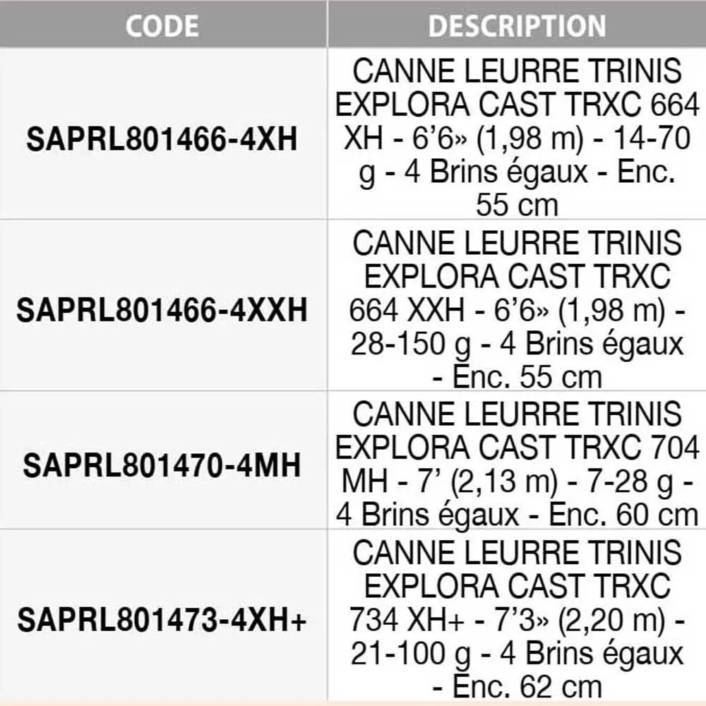 Denne Trinis Explora 6´6″ Extra Heavy er virkelig beregnet til fiskeri med store lokker såsom swimbaits eller jerkbaits. Beregnet til elskere af trofægedder eller eksotiske fisk som Aïmara eller Peacock bassen, vil denne Trinis Explora "rejse" version også appellere til havfiskere, der leder efter lette, handy og kraftfulde stænger for at være i stand til at animere tungt vægtede bløde lokker herunder torsk, sej, bas og mager er hovedmålene. Denne Trinis Explora stang vil tilfredsstille lystfiskere, der leder efter minimal bulk under transport eller opbevaring.