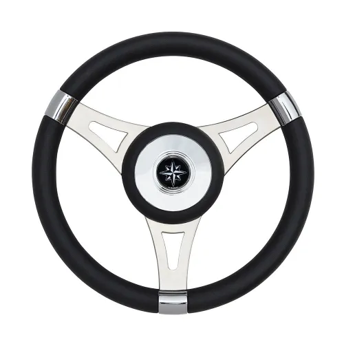 Stålnav, betræk af ægte læder med vindrose logo i midten.