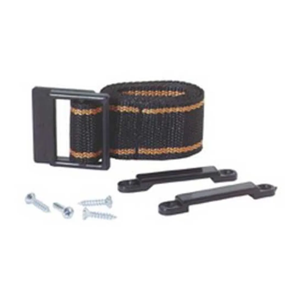 Die Gurte bestehen aus gewebtem Polypropylen mit "festgreifenden" Schnallen und sind vollständig beständig gegen Batteriesäure. Enthält vier 8x3/4 Zoll Schrauben und zwei Fußmannklemmen.