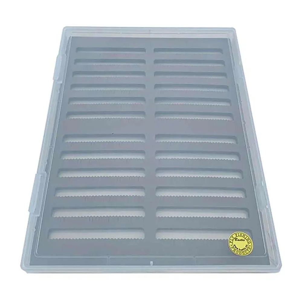 Im Mittelpunkt des Designs dieser Box steht ihr innovatives Fliegenhaltesystem. Es handelt sich um eine transparente Kunststoffbox mit EVA-Schaumstoffbändern, die präzisionsgefertigte Mikroschlitze für die einfache und sichere Platzierung Ihrer Fliegen aufweisen. Dieses Mikroschlitzsystem hält den Hakenbogen fest, ohne empfindliche Hecheln oder Materialien zu beschädigen, im Gegensatz zu herkömmlichen Schaumstoffboxen, bei denen Haken den Schaumstoff mit der Zeit zerreißen können. Der hochdichte EVA-Schaumstoff bietet einen sicheren Halt und stellt sicher, dass die Fliegen auch beim Transport über unwegsames Gelände an Ort und Stelle bleiben, ermöglicht aber eine mühelose Entnahme, wenn Sie am Wasser schnell wechseln müssen.
