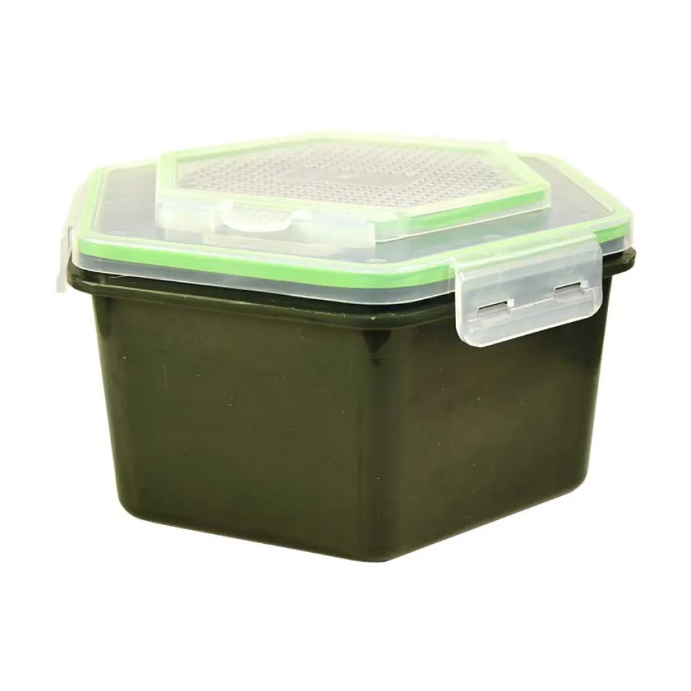 Eine robuste Köderbox aus Kunststoff mit einem dicht schließenden Kunststoffdeckel. Der Deckel verfügt über kleine Perforationen, die die Luftzirkulation ermöglichen und so für frische Köder sorgen. Die winzigen Löcher sind klein genug, um selbst kleinste Maden am Entkommen zu hindern. Die Boxdeckel sind mit praktischen Schnappverschlüssen an Ober- und Seite ausgestattet, was die Handhabung auch beim Anködern besonders komfortabel macht.