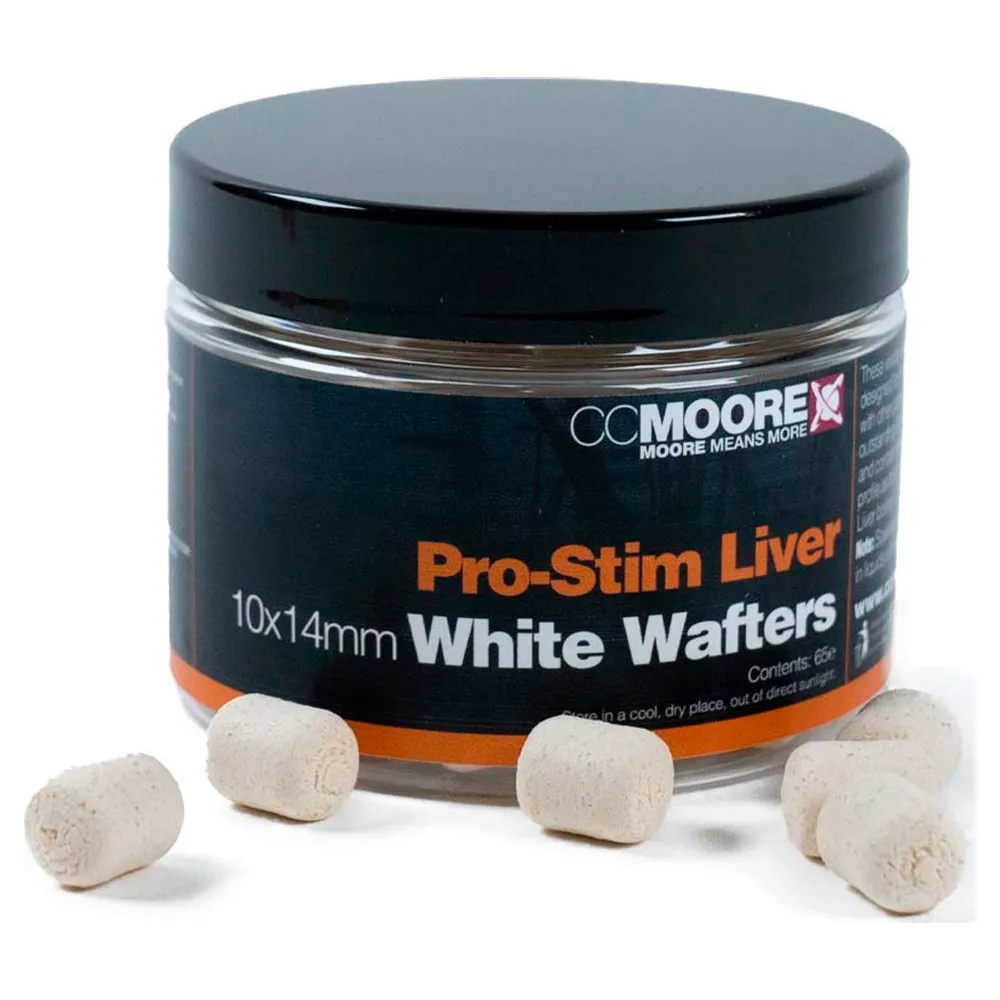 CC Moore Pro-Stim Liver White Dumbell Wafters 10X14mm: Diese leuchtend weißen 10x14mm Wafter enthalten unsere potente, geräucherte Knoblauchwurst Pro-Stim Liver Geschmacksrichtung und sind daher ideal zum Angeln als einzelner, hochattraktiver Hakenköder oder in Verbindung mit Produkten aus unserer Pro-Stim Liver Boilie-Reihe.