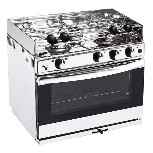 Ausgestattet mit Sicherheitsthermoelement, seitlichem Flammenschutz, Brennern aus Gusseisen, Anti-Roll-Topfhalter, Backofentürverriegelung und Kardanstütze (30 ° neigbar).