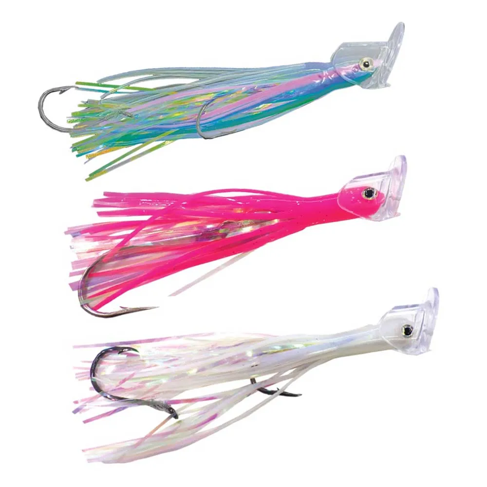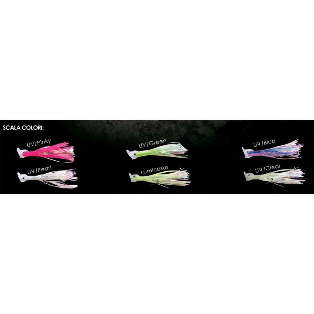 Erhältlich in 6 verschiedenen Farben in den Größen 80, 100 und 120 mm, bestückt mit MUSTAD Haken Serie 92553 Größe 1/0, 2/0 und 3/0, handgefertigtes italienisches Terminal aus Fluorocarbon, 3D-Augen und UV-Kopf.