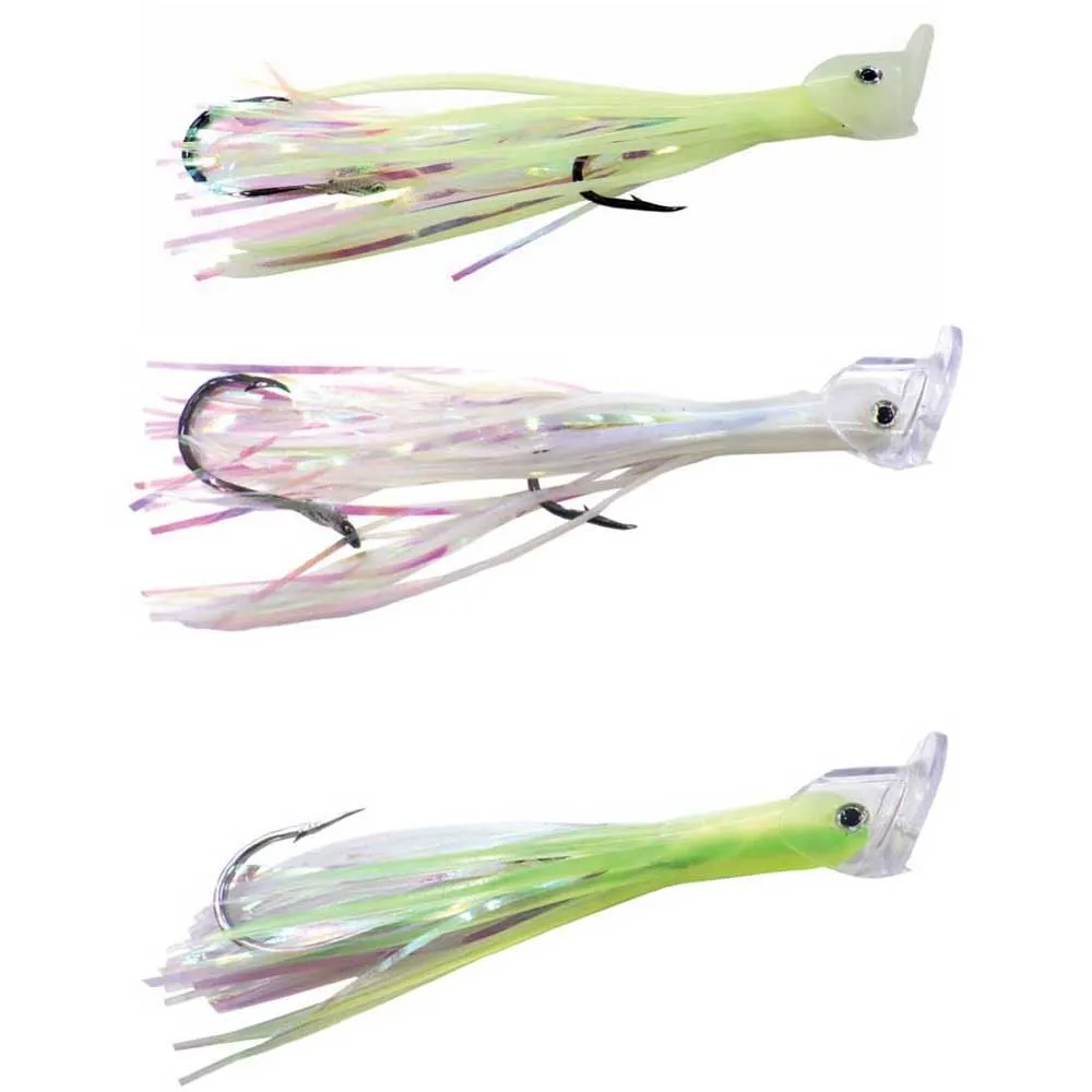 Erhältlich in 6 verschiedenen Farben in den Größen 80, 100 und 120 mm, bestückt mit MUSTAD Haken Serie 92553 Größe 1/0, 2/0 und 3/0.