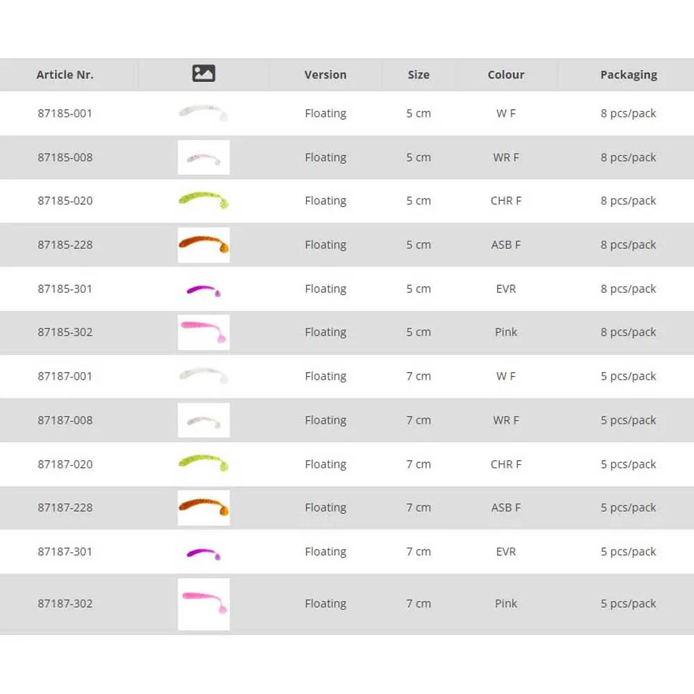 Die Farboptionen ASBF, CHRF, EVR, PINK, WF und WRF erhöhen die optische Attraktivität dieses Köders und sorgen dafür, dass er sich bei verschiedenen Wasserbedingungen von den Fischen abhebt. Ob Sie in klarem oder trübem Wasser fischen, es gibt eine Farbkombination, die der natürlichen Beute Ihrer Zielart entspricht.