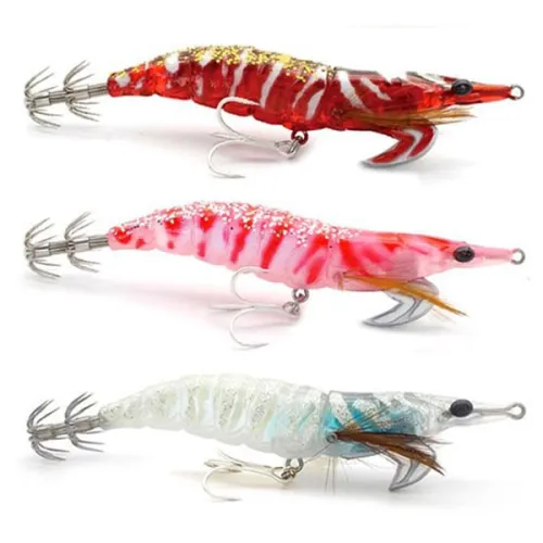Ultra-realistischer Köder mit Garnelenkörper, Federflossen und "Beinen", ausgestattet mit einem Drilling am Bauch und einem Doppelhaken am Rücken, einsetzbar sowohl zum Spinnfischen als auch zum Eging.