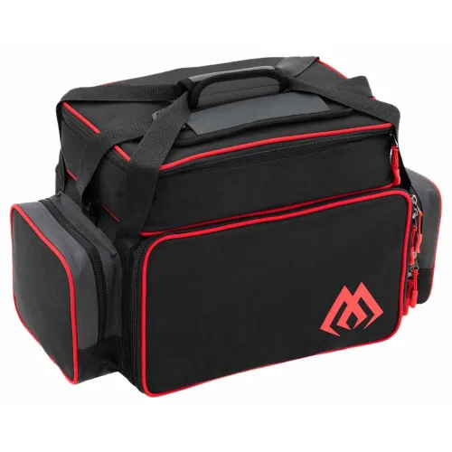 Eine große Tasche mit Boxen, einem Armschlauf und einem Griff ist in zwei Hauptkammern unterteilt. Der obere Teil eignet sich hervorragend zur Aufbewahrung größerer Gegenstände, während der untere Teil, der mit Boxen ausgestattet ist, für das Verstauen von Zubehör und Ködern vorgesehen ist.