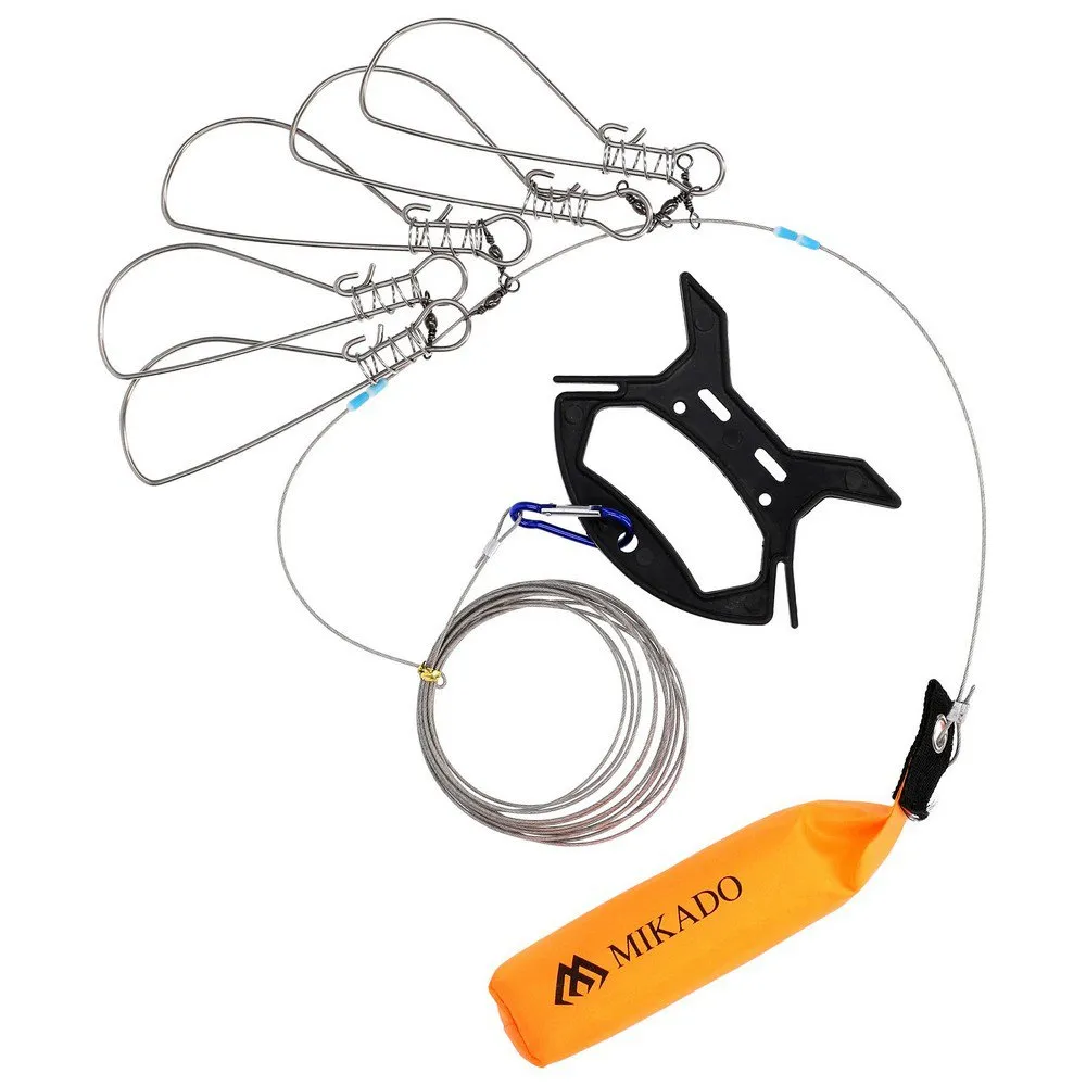 Effektive und praktische Schnappverschlüsse, um lebende Fische im Wasser zu halten. Das Set ist mit einer Schnur ausgestattet, die mit einem Schwimmer versehen ist, der das Rig vor versehentlichem Verlieren schützt. Besonders nützlich für das Bootsangeln.