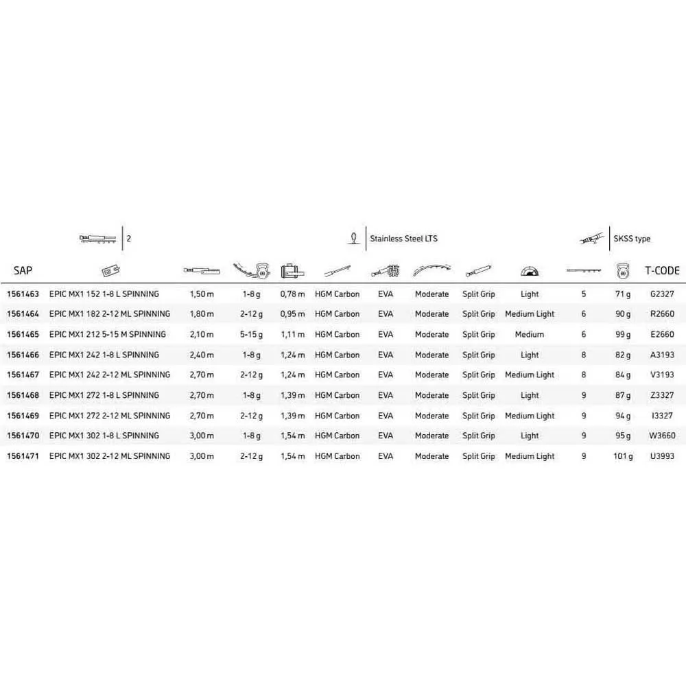 Die Spinnruten der Epic Mx1-Serie sind für das Angeln mit leichten Kunstködern und Forellen konzipiert. Die Blanks haben eine moderate Aktion, wodurch sehr leichte Kunstköder, Bombettas und Posen geworfen werden können. Ideale Ruten zum Angeln auf Forelle (Teich) oder Flussangeln mit Schwimmer. Veredelt mit leichten Komponenten machen diese Ruten für ihre Preisklasse herausragend.